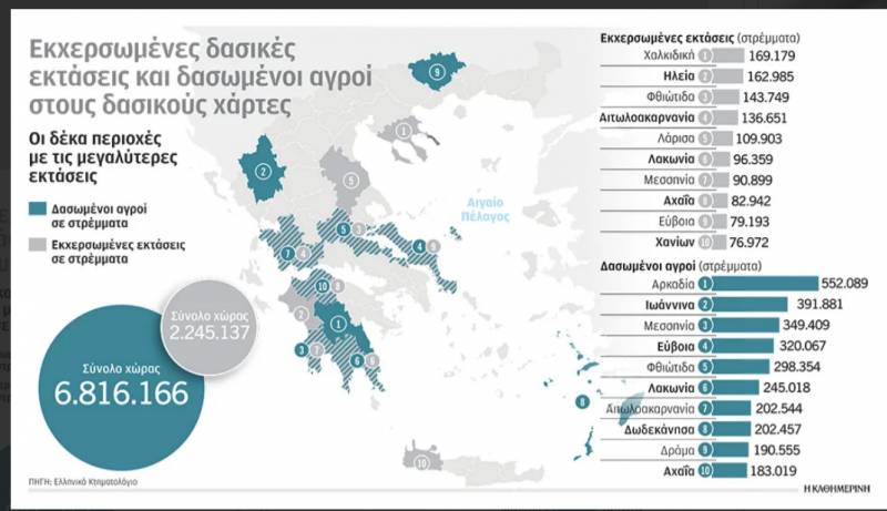 Συγκεκριμένα και σύμφωνα με την "Καθημερινή", στη Μεσσηνία που έχει συνολική έκταση 2.996.000 στρ., τα 349.409 είναι δασωμένοι αγροί και τα 90.899 είναι εκχερσωμένες εκτάσεις με βάση αεροφωτογραφίες του 1946.