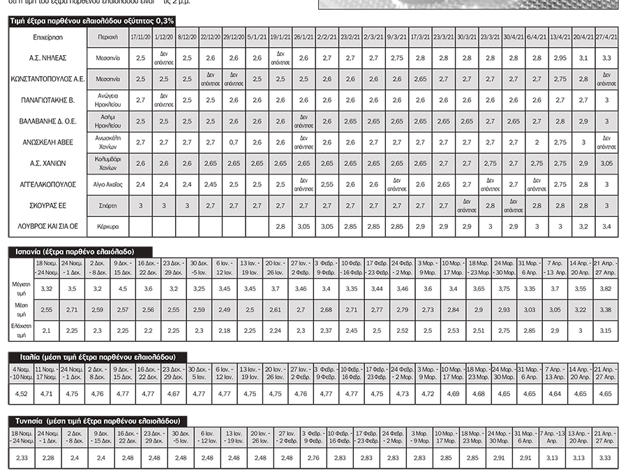Αναλυτικά οι τιμές ανά χώρα παρουσιάζονται στους πίνακες σύμφωνα με το παρατηρητήριο τιμών του Συνδέσμου Ελαιοκομικών Δήμων Κρήτης (ΣΕΔΗΚ) και την εβδομαδιαία έρευνα του ιταλικού Ινστιτούτου Υπηρεσιών Γεωργίας και Αγοράς Τροφίμων (ISMEA).