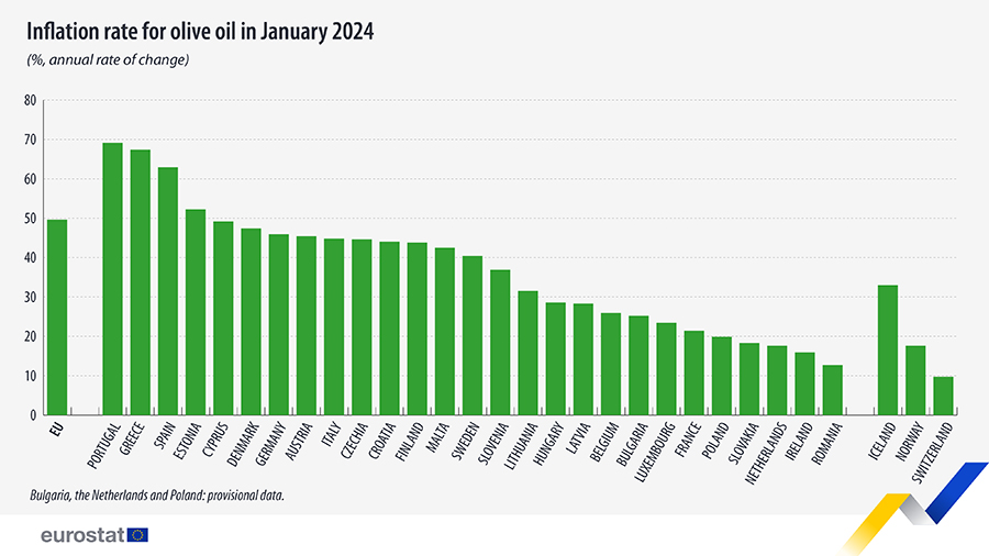 Τον Ιανουάριο του 2024, όλες οι χώρες της ΕΕ ανέφεραν αύξηση του ετήσιου πληθωρισμού του ελαιολάδου. Η υψηλότερη αύξηση καταγράφηκε στην Πορτογαλία (+69% σε σύγκριση με τον Ιανουάριο του 2023), ακολουθούμενη από την Ελλάδα (+67%) και την Ισπανία (+63%).