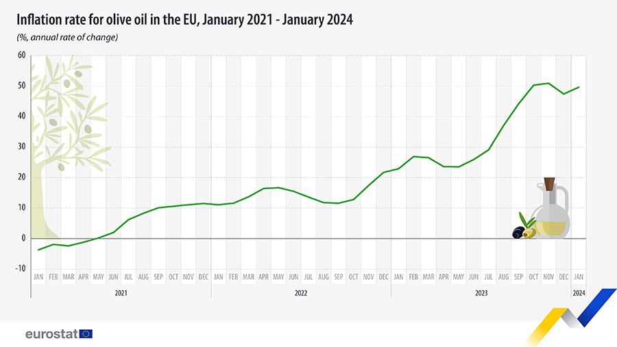 Τον Ιανουάριο του 2024, σύμφωνα με την Εurostatat, η τιμή του ελαιολάδου στην ΕΕ ήταν 50% υψηλότερη από τον Ιανουάριο του 2023.