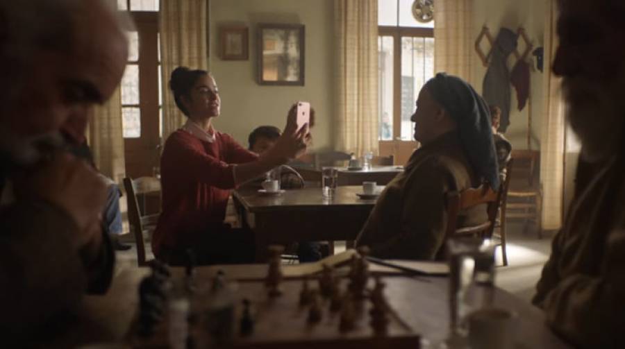 Η διαφήμιση έχει τίτλο "Take Mine", και δείχνει ένα νεαρό κορίτσι που φτάνει σε ένα ελληνικό παραθαλάσσιο χωριό για να επισκεφθεί τη γιαγιά της. Στο καφενείο του χωριού η εγγονή φωτογραφίζει τη γιαγιά χρησιμοποιώντας την λειτουργία του I phone "Πορτραίτο", διαθέσιμη αποκλειστικά στις μεγαλύτερες συσκευές της Apple. Ο ενθουσιασμός της γιαγιάς της για τη φωτογραφία είναι μεταδοτικός σε όλο το χωριό, το οποίο παίρνει σειρά και ποζάρει στο κινητό της. Κάπως έτσι, η νεαρή αρχίζει να φωτογραφίζει όλο το χωριό. Τα παιδιά, οι γειτόνισσες, ο ιερέας, ένας ψαράς και ο βοσκός, η νεολαία του χωριού συγγενείς και φίλοι.