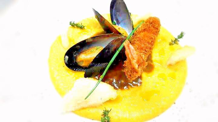 Φάβα με παναρισμένες κόκκινες Γαρίδες Μεσσηνίας σε κανταΐφι και μύδια αχνιστά