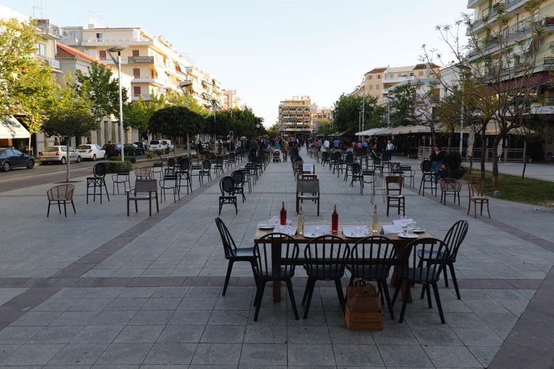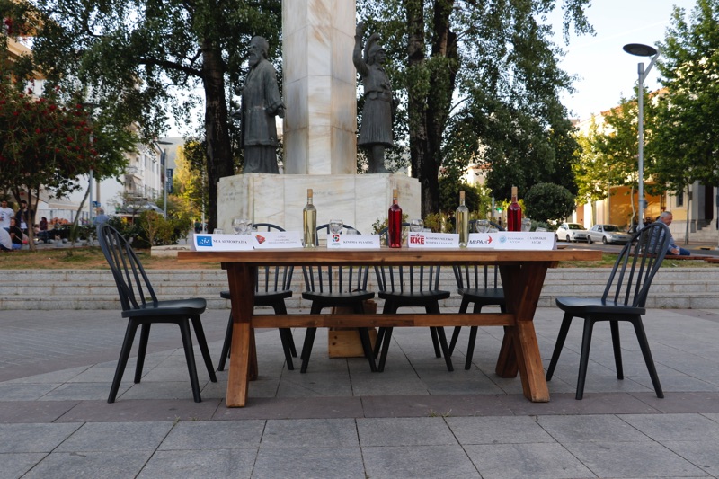 Στην πάνω πλευρά στο άγαλμα των ηρώων του 1821, είχε στρωθεί πολυτελώς και συμβολικά ένα τραπέζι για 6, μία θέση για κάθε κοινοβουλευτικό κόμμα, ενώ οι άδειες καρέκλες είχαν απλωθεί ως ένδειξη διαμαρτυρίας για τις επιπτώσεις του κορονοϊού και των περιοριστικών μέτρων στην οικονομική τους δραστηριότητα.