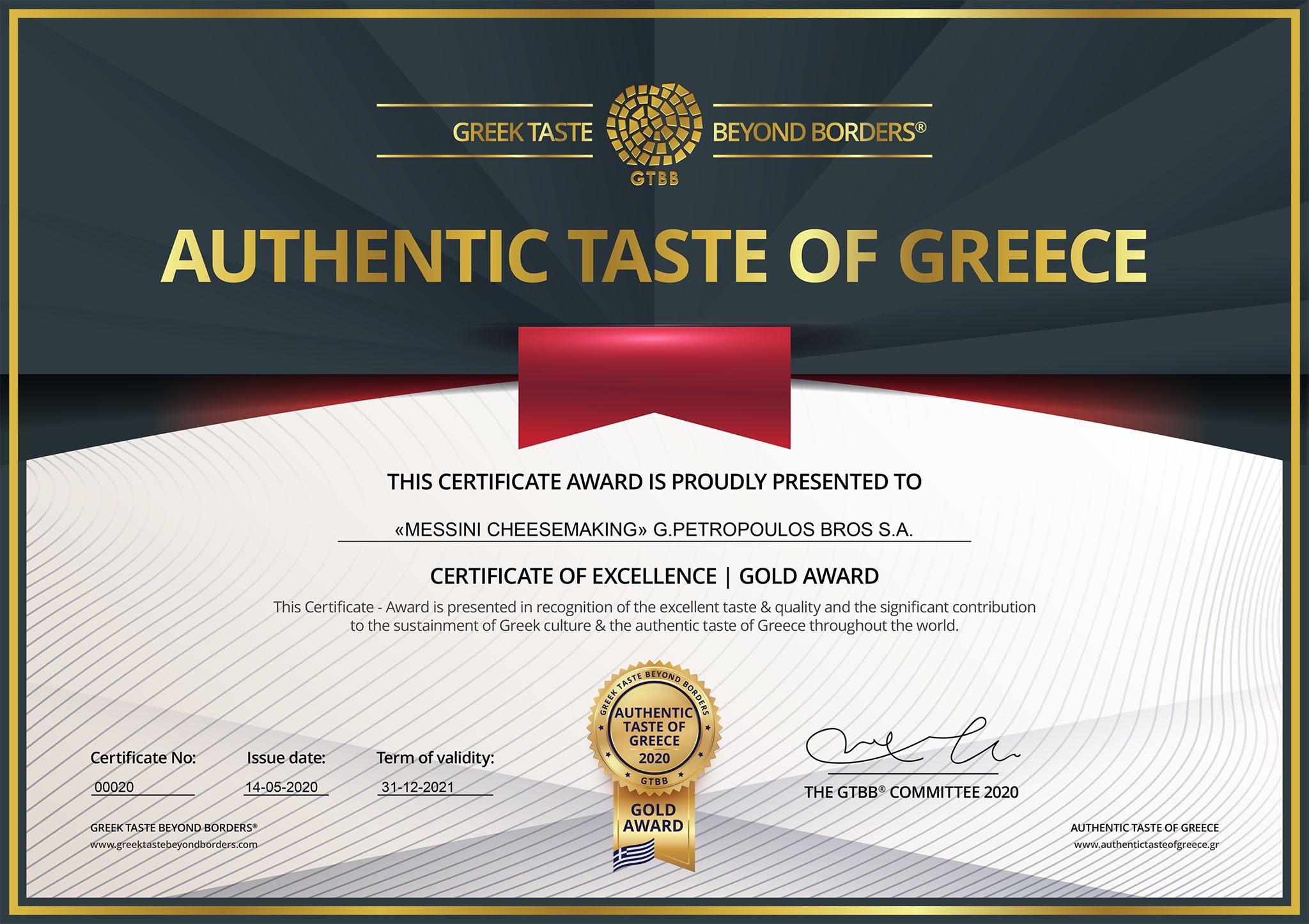 Η πιστοποίηση έγινε από τον οργανισμό Greek Taste Beyond Borders® GTBB που κυριαρχεί στην προώθηση της ελληνικής γεύσης και γαστρονομίας σε όλο τον κόσμο, χρησιμοποιώντας σύγχρονες μεθόδους branding και την πιο αποτελεσματική επιχειρηματική πλατφόρμα δικτύωσης για την Ελλάδα και την παγκόσμια εκπροσώπησή της. Τα διάσημα βραβεία που αναφέρονται ως «top honors» από την GTBB διαδραματίζουν σημαντικό ρόλο και απονέμονται αποκλειστικά σε κορυφαίες ελληνικές μάρκες για τα άριστα ποιοτικά τους πρότυπα και τη συμμόρφωσή τους με τις βασικές αξίες.