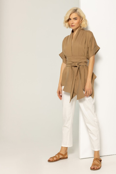 Εάν θέλετε να ξεχωρίσετε για τις ενδυματολογικές σας προτιμήσεις, επιλέξτε την όχι και τόσο συνηθισμένη αλλά απίστευτα κομψή επιλογή του κιμονό. Δίνει μια εξωτική αίσθηση της Άπω Ανατολής προσαρμοσμένη στη μόδα του σήμερα. Το ασύμμετρο κιμονό PERUGIA είναι φτιαγμένο από λινό ύφασμα, βαμβάκι και Lyocel. Η obi ζώνη κολακεύει μοναδικά κάθε γυναικείο σώμα.