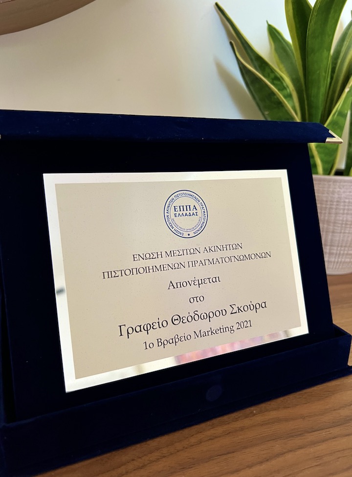 Το πρόσφατο βραβείο αφορά στις τακτικές Marketing και απονεμήθηκε στην εταιρεία από την Ένωση Μεσιτών Ακινήτων Πιστοποιημένων Πραγματογνωμόνων Ελλάδας (ΕΠΠΑ), στο Gala που πραγματοποιήθηκε στο Σάββατο 14 Μαΐου σε κεντρικό ξενοδοχείο της Αθήνας.