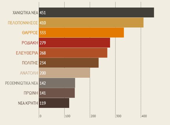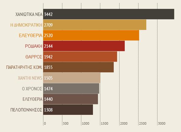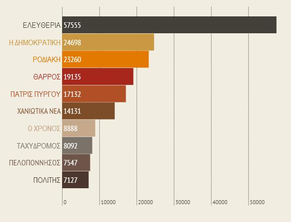 Αναλυτικά, στο Facebook η σελίδα της "Ελευθερίας" έφτασε τα 57.555 likes κατακτώντας για άλλον ένα μήνα την πρώτη θέση μεταξύ των περιφερειακών εφημερίδων της χώρας. Στο κοινωνικό δίκτυο που επισκέπτεται καθημερινά σχεδόν το σύνολο των χρηστών του Διαδικτύου, η "Ελευθερία" της Μεσσηνίας συγκεντρώνει κοινό υπερδιπλάσιο από την δεύτερη στην κατάταξη "Δημοκρατική" της Ρόδου που φτάνει τα 24.698 likes. Στην τρίτη θέση βρίσκεται η "Ροδιακή" με 23.260 likes.