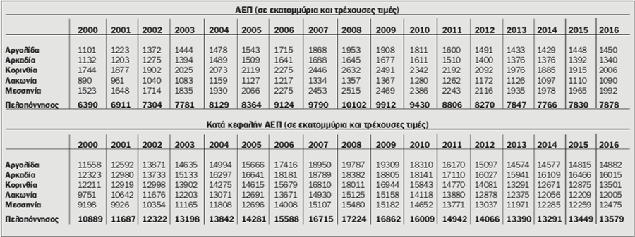 Αντίστοιχα, η Περιφέρεια Πελοποννήσου "επέστρεψε" στο ΑΕΠ του 2003, καθώς και το 2016 παρήγαγε προϊόντα και υπηρεσίες αξίας 17,6 εκ. ευρώ - ενώ το 2008 το περιφερειακό ΑΕΠ είχε αγγίξει τα 24,1 δισεκατομμύρια.