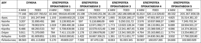 Αναλυτικά τα στοιχεία του υπουργείου Οικονομικών για την επιστρεπτέα προκαταβολή στην Πελοπόννησο παρουσιάζονται στον πίνακα.