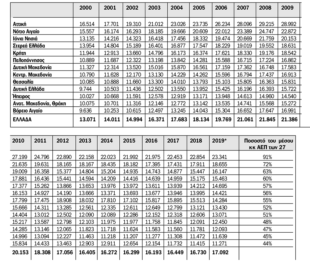 Αναλυτικά, το κατά κεφαλήν ΑΕΠ των Περιφερειών της Ελλάδας από το 2009 μέχρι το 2019 παρουσιάζεται στον πίνακα: