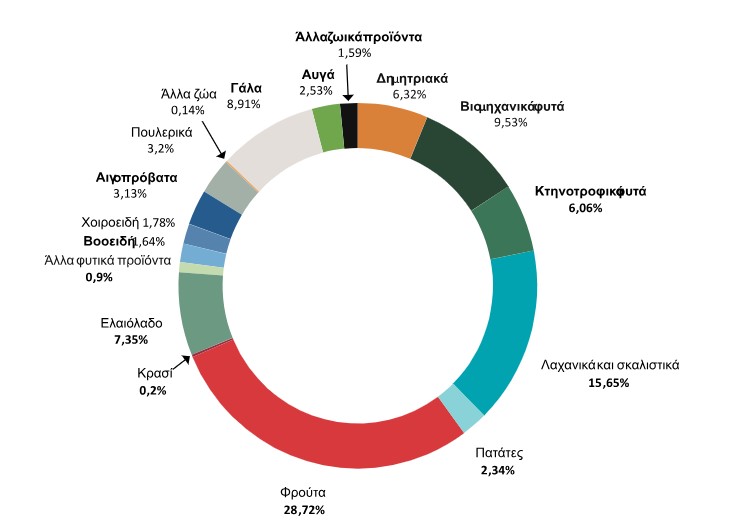 Η αξία της συνολικής γεωργικής παραγωγής στη χώρα μας αντιστοιχεί σε περίπου 2,8% της συνολικής γεωργικής παραγωγής των χωρών της ΕΕ, ενώ ως προς τη σύνθεσή της, σαφής είναι η υπεροχή της φυτικής παραγωγής έναντι της ζωικής. Πάνω από τη μισή αξία όλης της ελληνικής γεωργικής παραγωγής προέρχεται από τρεις κατηγορίες που συνδέονται με την υγιεινή διατροφή: τα φρούτα, τα λαχανικά και το ελαιόλαδο.
