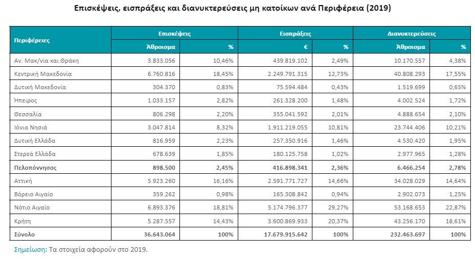 Η συμβολή του τουρισμού στην οικονομία της χώρας μας ανήλθε στο 12,6% του ΑΕΠ το έτος-ορόσημο 2019. Oι αφίξεις μη κατοίκων επισκεπτών ξεπέρασαν τα 34 εκατ., με μέσο όρο φιλοξενίας τις επτά βραδιές.