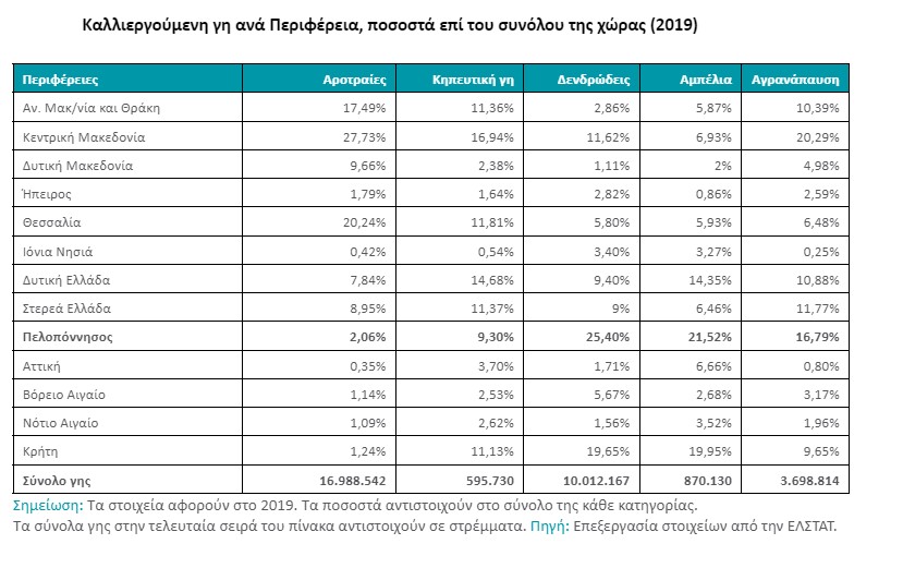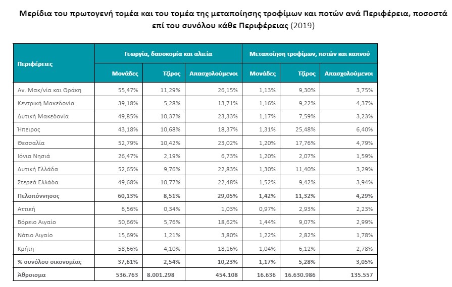 Σύμφωνα με τα στοιχεία που δημοσιεύονται στην έρευνα στην Περιφέρεια Πελοποννήσου λειτουργεί μόνο το 4,5% των ξενοδοχειακών μονάδων της Ελλάδας ενώ εκτείνεται το 25,04% των δενδροειδών καλλιεργειών (σε Μεσσηνία και Λακωνία το 20% των ελαιώνων), το 21,5% των αμπελώνων και το 9,3% των κηπευτικών καλλιεργειών ενώ παράγεται επίσης το 12,26% των προϊόντων ζωικής προέλευσης και το 12,28% του μελιού. Αξίζει να σημειωθεί ότι στην Περιφέρεια Πελοποννήσου το 60,13% των επιχειρήσεων δραστηριοποιείται στον πρωτογενή τομέα και το ποσοστό αυτό είναι το μεγαλύτερο στην Ελλάδα. Το μεγαλύτερο ποσοστό 29,05% στην Ελλάδα είναι και το ποσοστό των απασχολούμενων στον πρωτογενή τομέα της Περιφέρειας Πελοποννήσου ενώ ο τζίρος του ίδιου τομέα αντιστοιχεί στο 8,51% του περιφερειακού ΑΕΠ