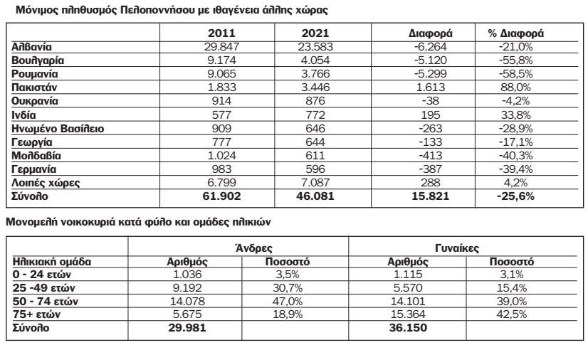Συγκεκριμένα και σύμφωνα με τα στοιχεία της Ελληνικής Στατιστικής Αρχής για την απογραφή του 2021 που δόθηκαν προχθές στη δημοσιότητα έφυγε 1 στους 5 Βαλκάνιους μόνιμους κατοίκους της Περιφέρειας Πελοποννήσου με συνέπεια να μειωθεί ο πληθυσμός τους κατά 16.683 κατοίκους. Ειδικότερα ο πληθυσμός των μονίμων κατοίκων της Περιφέρειας Πελοποννήσου με ιθαγένεια Αλβανίας μειώθηκε κατά 6.264 κατοίκους (-21%), με ιθαγένεια Βουλγαρίας κατά 5.120 κατοίκους (-55,8%) και με ιθαγένεια Ρουμανίας κατά 5.299 κατοίκους (-58,5%). Αξιοσημείωτη είναι η μείωση των Γερμανών των Βρετανών μονίμων κατοίκων της Περιφέρειας Πελοποννήσου κατά 39,4% και 28,9% αντίστοιχα΄