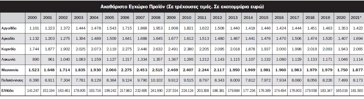 Από εκεί και πέρα τα ίδια ισχύουν και για την υπόλοιπη Περιφέρεια αφού το πολύ υψηλό κατά κεφαλήν ΑΕΠ της Αρκαδίας προφανώς οφείλεται στην εκτόξευση του ΑΕΠ σε τρέχουσες τιμές κατά 287 εκατ. ευρώ (αύξηση 20% σε σχέση με την προηγούμενη χρόνια) λόγω της αύξησης της τιμής του ηλεκτρικού ρεύματος που παράγεται στη Μεγαλόπολη. Στη Μεσσηνία το 2021 σε σχέση με το 2020 το κατά κεφαλήν ΑΕΠ αυξήθηκε κατά 7,6% και ουσιαστικά διορθώθηκε η μείωση της προηγούμενης χρονιάς εξαιτίας της Covid -19. Αξίζει να σημειωθεί ότι στη Μεσσηνία το υψηλότερο κατά κεφαλήν ΑΕΠ (15.480 ευρώ) καταγράφηκε το 2008