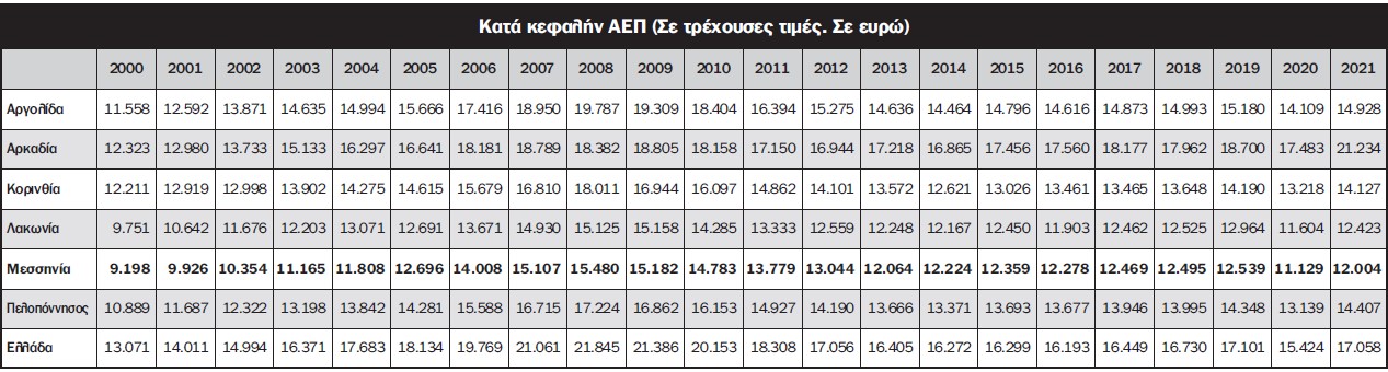 Σε απόλυτους αριθμούς και σύμφωνα με τα στοιχεία που έδωσε στη δημοσιότητα η Ελληνική Στατιστική Αρχή, η Μεσσηνία έχει κατά κεφαλήν ΑΕΠ 12.004 ευρώ (αντιστοιχεί στο 43% του Ευρωπαϊκού και στο 70% του Ελληνικού), η Λακωνία 12.423 ευρώ, η Κορινθία 14.127 ευρώ, η Αργολίδα 1.422 ευρώ, η Αρκαδία 21.234 ευρώ, η Περιφέρεια Πελοποννήσου 14.407 ευρώ και η Ελλάδα 17.058 ευρώ. Τόσο τα στοιχεία για το κατά κεφαλήν ΑΕΠ όσο και τα στοιχεία του ΑΕΠ αποδεικνύουν ότι η Μεσσηνία παραμένει ένας από τους φτωχότερους νομούς της Ευρώπης επειδή δεν μπορεί να αξιοποιήσει τον παραγωγικό της πλούτο