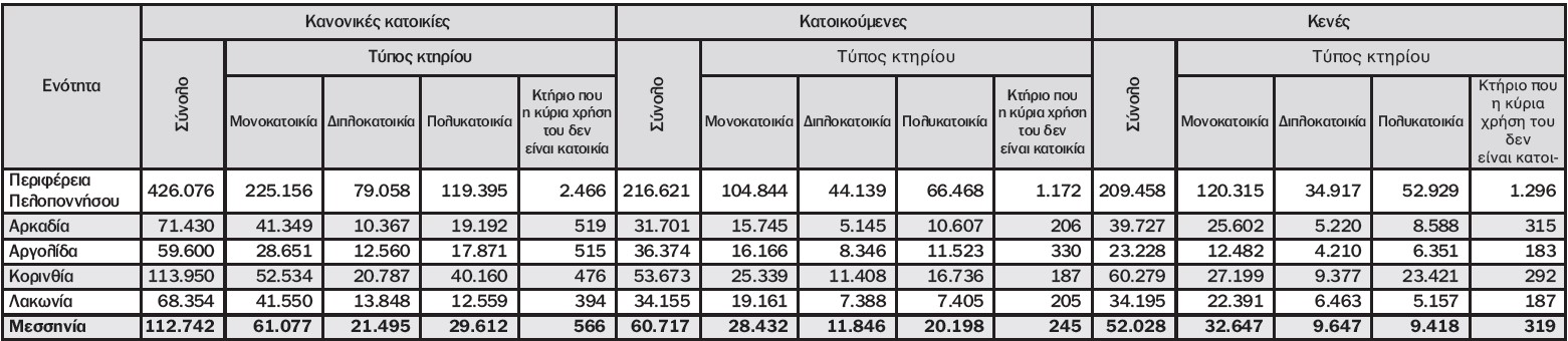Στην Κορινθία απογράφηκαν 113.950 κατοικίες, 112.742 στη Μεσσηνία, 71.430 στην Αρκαδία, 68.354 στη Λακωνία και 59.600 στην Αργολίδα.
