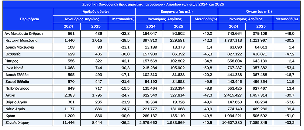 Σύμφωνα με την Ελληνική Στατιστική Αρχή Το τετράμηνο Ιανουαρίου - Απριλίου 2025, η Συνολική Οικοδομική Δραστηριότητα εμφανίζει, στο σύνολο της Χώρας, μείωση κατά 26,2% στον αριθμό των οικοδομικών αδειών, μείωση κατά 40,5% στην επιφάνεια και μείωση κατά 33,2% στον όγκο, σε σχέση με το αντίστοιχο τετράμηνο του έτους 2024. Κατά την ίδια περίοδο Ιανουαρίου - Απριλίου 2025, η Ιδιωτική Οικοδομική Δραστηριότητα, εμφανίζει στο σύνολο της Χώρας, μείωση κατά 26,4% στον αριθμό των οικοδομικών αδειών, μείωση κατά 40,6% στην επιφάνεια και μείωση κατά 32,8% στον όγκο, σε σχέση με την περίοδο Ιανουαρίου -Απριλίου 2024