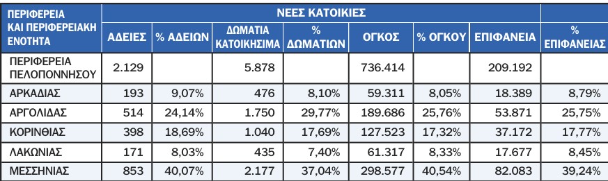 Η εικόνα της οικοδομικής δραστηριότητας δείχνει καθαρά πού κατευθύνεται η ζήτηση. Η Μεσσηνία αποτελεί τον βασικό πόλο ανάπτυξης στην Περιφέρεια. Ξεπερνά με μεγάλη διαφορά τις άλλες περιφερειακές ενότητες σε άδειες, όγκο και επιφάνεια. Συγκεντρώνει πάνω από το 40% του συνολικού όγκου και σχεδόν το 39% της επιφάνειας νέων κατοικιών.