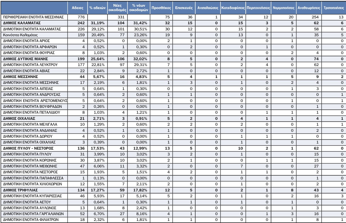 Στον αντίποδα, η εικόνα σε δήμους της ενδοχώρας είναι υποτονική. Ο Δήμος Μεσσήνης περιορίζεται στο 5,67% των νέων οικοδομών και ο Δήμος Οιχαλίας στο 2,71%. Τα ποσοστά αυτά αποτυπώνουν χαμηλή οικιστική δυναμική.