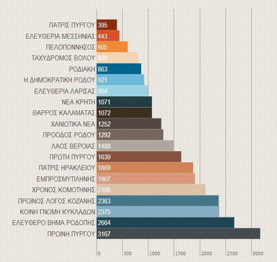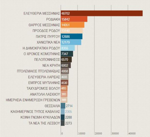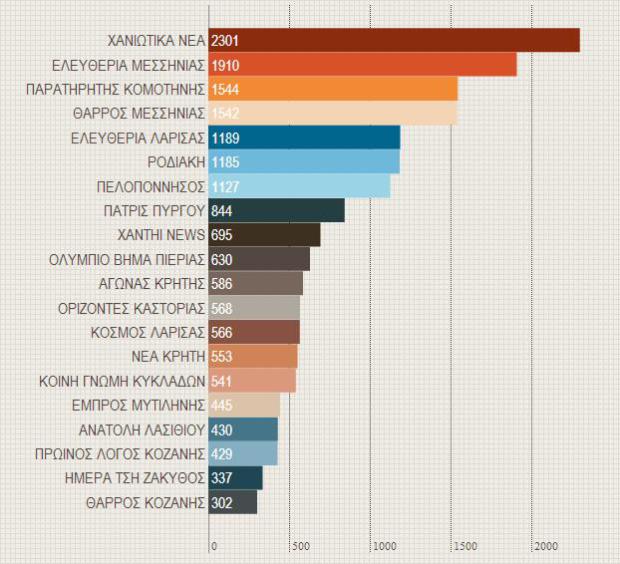 Δημοφιλέστερη τοπική εφημερίδα στο Facebook με μεγάλη διαφορά από τις υπόλοιπες είναι η "Ελευθερία" της Μεσσηνίας με 48.702 Likes. Στη δεύτερη θέση βρίσκεται η εφημερίδα "Ροδιακή" με 15.842 Likes. Πολύ μεγάλη άνοδο σημειώνει η εφημερίδα "Θάρρος" της Μεσσηνίας η οποία με 14.051 Likes περνάει στην τρίτη θέση. Εντυπωσιακή αύξηση 97,24% καταγράφει ο αριθμός των Likes (13.140) της εφημερίδας "Πρόοδος" Ρόδου η οποία περνάει στην τέταρτη θέση. Παρά το γεγονός ότι αύξησε τον αριθμό των Likes στη σελίδα της η "Πατρίς" Πύργου με 12.886 Likes πέφτει στην πέμπτη θέση. Ακολουθούν τα "Χανιώτικα Νέα", η "Δημοκρατική" της Ρόδου, ο "Χρόνος" της Κομοτηνής, η εφημερίδα "Πελοπόννησος" και η "Νέα Κρήτη".