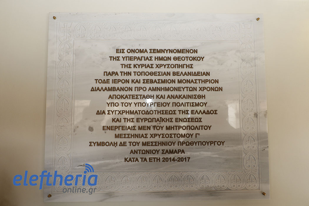 Την πλάκα με τα στοιχεία του έργου αποκατάστασης της μονής (από τους καταστροφικούς σεισμούς του 1986) ο μητροπολίτης την αποκάλυψε μαζί με το δήμαρχο Καλαμάτας Παναγιώτη Νίκα, παρουσία της αντιπεριφερειάρχη Μεσσηνίας Ελένης Αλειφέρη και της θεματικής αντιπεριφερειάρχη Ντίνας Νικολάκου, η οποία... έσπρωξε και υποσκέλισε το δήμαρχο κι έκοψε μαζί με το μητροπολίτη την κορδέλα της τραπεζαρίας, στο κεντρικό σημείο της μονής. Το γεγονός προκάλεσε την αντίδραση του κ. Νίκα, ο οποίος την εξέπληξε δημόσια για την ασεβή συμπεριφορά της προς το δήμαρχο της πόλης.