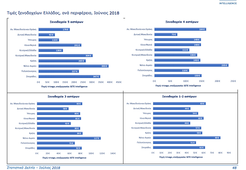 "Τον Ιούνιο του 2018, στις κατηγορίες 1-2 αστέρων οι ελληνικοί προορισμοί παρουσίασαν αύξηση με εξαίρεση την Ηπειρο. Στην κατηγορία των 3 αστέρων η πλειοψηφία των προορισμών παρουσίασε αύξηση πλην της Αν. Μακεδονίας και Θράκης και των Σποράδων. Στην κατηγορία των 4 αστέρων μείωση παρουσίασε μόνο η Αν. Μακεδονία και Θράκη, ενώ μεικτή ήταν η εικόνα στην κατηγορία 5 αστέρων.