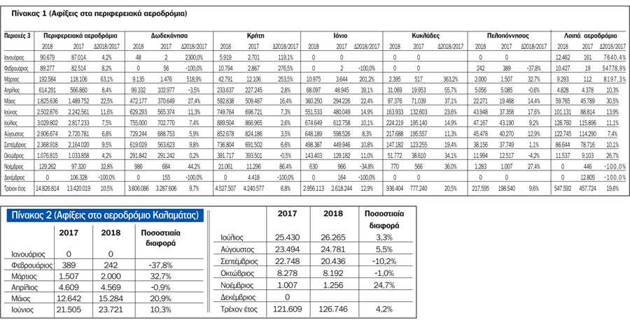 Αναλυτικά οι αφίξεις αλλοδαπών στα περιφερειακά αεροδρόμια απεικονίζονται στον πίνακα 1 και οι αφίξεις στο αεροδρόμιο της Καλαμάτας στον πίνακα 2.