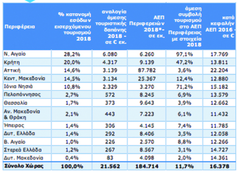 Αναλυτικά και σύμφωνα με στοιχεία του ΣΕΤΕ η άμεση τουριστική δαπάνη του 2018 και η συμβολή της στο ΑΕΠ ανά περιφέρεια παρουσιάζονται στον πίνακα: