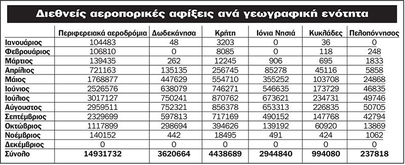 Αναλυτικά οι διεθνείς αφίξεις στα περιφερειακά αεροδρόμια ανά γεωγραφική ενότητα παρουσιάζονται στον πίνακα.
