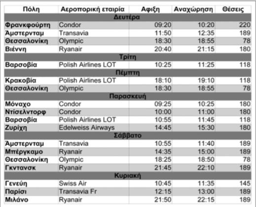 Αξίζει πάντως να σημειωθεί ότι σε εβδομαδιαία βάση οι περισσότερες πτήσεις έρχονται από την Πολωνία (δύο από Βαρσοβία και μία από Κρακοβία και Γκντανσκ) και τη Γερμανία (μία πτήση την εβδομάδα από Φρανκφούρτη, Μόναχο και Ντίσελντορφ). Η σύνδεση με Πολωνία ενισχύθηκε στο... παρά πέντε με τρεις νέες πτήσεις της πολωνικής εταιρείας Polish Airlines LOT για Βαρσοβία και Κρακοβία που προστέθηκαν στην προγραμματισμένη από το χειμώνα πτήση της Ryanair για Γκντανσκ.