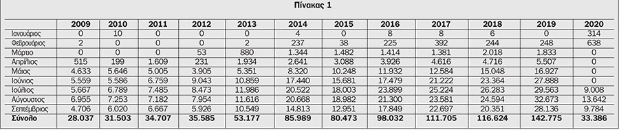 Αναλυτικά οι αφίξεις διεθνών πτήσεων του πρώτου εννιαμήνου στο "Καπετάν Βασίλης Κωνσταντακόπουλος" από το 2009 έως το 2020 παρουσιάζονται στον πίνακα 1.
