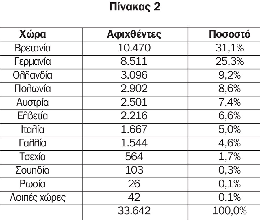 Στον πίνακα 2 παρουσιάζεται η εθνικότητα των αφιχθέντων με τακτικές πτήσεις και αεροταξί του 2020.