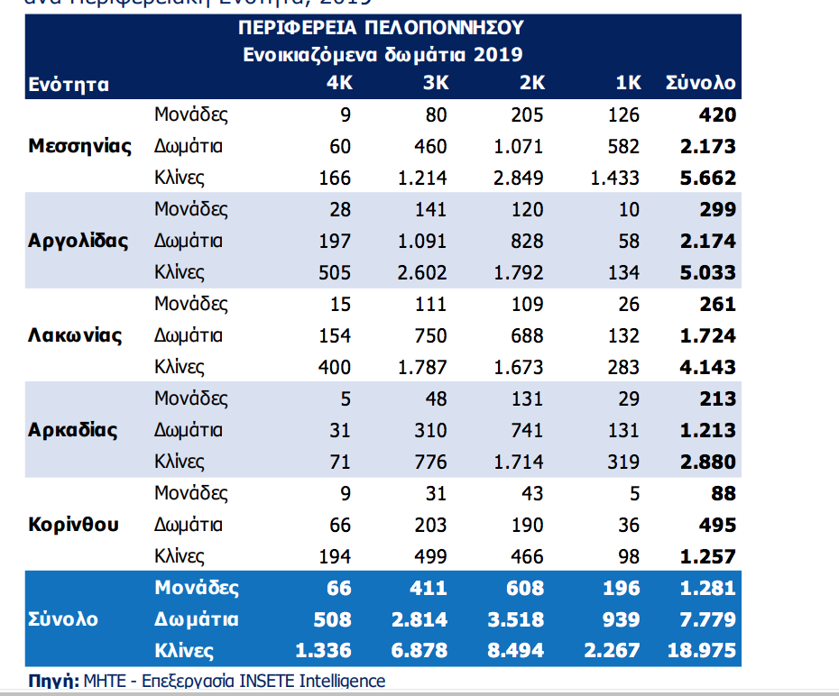 • Η Ενότητα Αργολίδας διαθέτει το 19% του δυναμικού της Περιφέρειας με 184 μονάδες, 264 δωμάτια και 1.723 κλίνες.