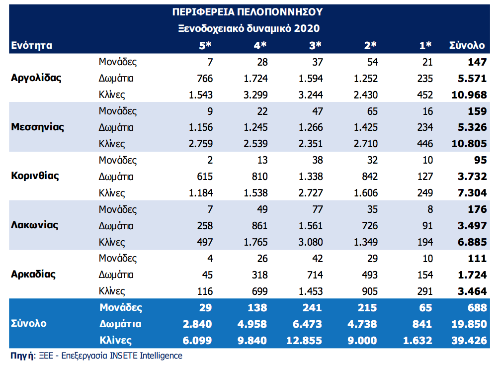 Η Περιφέρεια Πελοποννήσου το 2020 αντιπροσωπεύει το 7% των ξενοδοχειακών μονάδων, το 5% των δωματίων και το 5% των κλινών της χώρας. Συνολικά διαθέτει 688 μονάδες με 19.850 δωμάτια και 39.426 κλίνες.