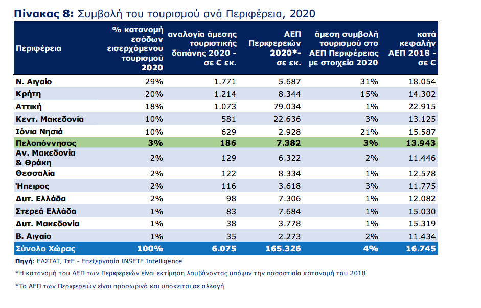 Σύμφωνα με την έκθεση η Περιφέρεια Πελοποννήσου αντιπροσωπεύει μόλις το 3% των εισπράξεων που καταγράφηκαν στην Ελλάδα το 2020.