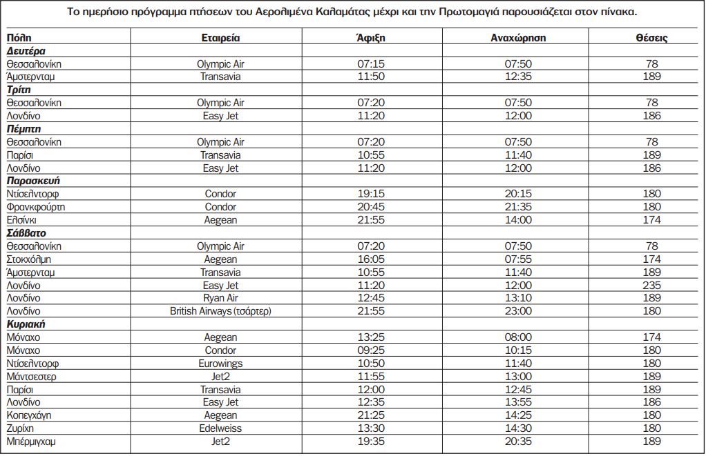 Το ημερήσιο πρόγραμμα πτήσεων του Αερολιμένα Καλαμάτας μέχρι και την Πρωτομαγιά παρουσιάζεται στον πίνακα: