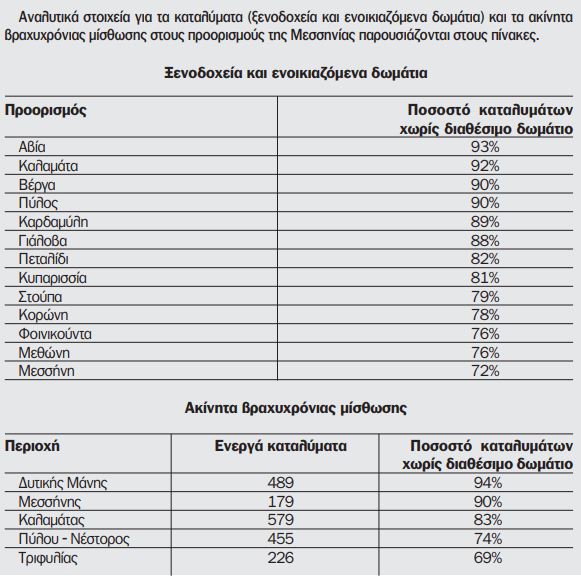 Σύμφωνα με χθεσινή έρευνα της "Ε", στο booking.com το 86% των καταλυμάτων της Μεσσηνίας δεν έχει διαθέσιμο δωμάτιο, ενώ σύμφωνα με έρευνά μας στην πλατφόρμα της Airbnb, η πληρότητα κυμαίνεται από 69% στην Τριφυλία μέχρι 95% στη Δυτική Μάνη.