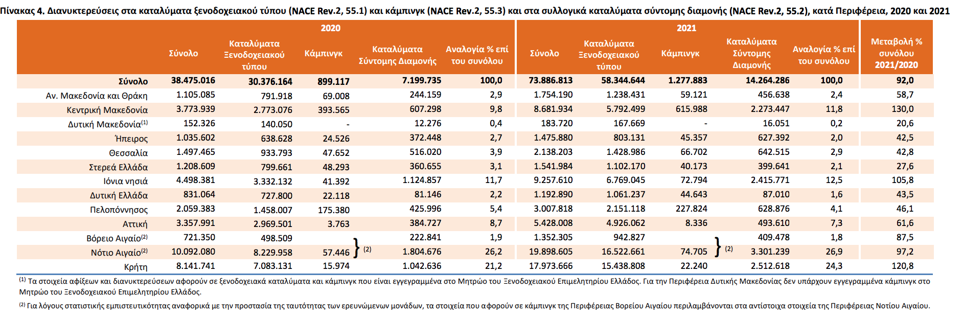Αξίζει να σημειωθεί ότι η πληρότητα των ξενοδοχείων το 2021 στην Περιφέρεια Πελοποννήσου μόλις έφτασε το 31,2% ενώ στην Κρήτη, τα Ιόνια Νησιά και το Νότιο Αιγαίο ξεπέρασε το 50%.