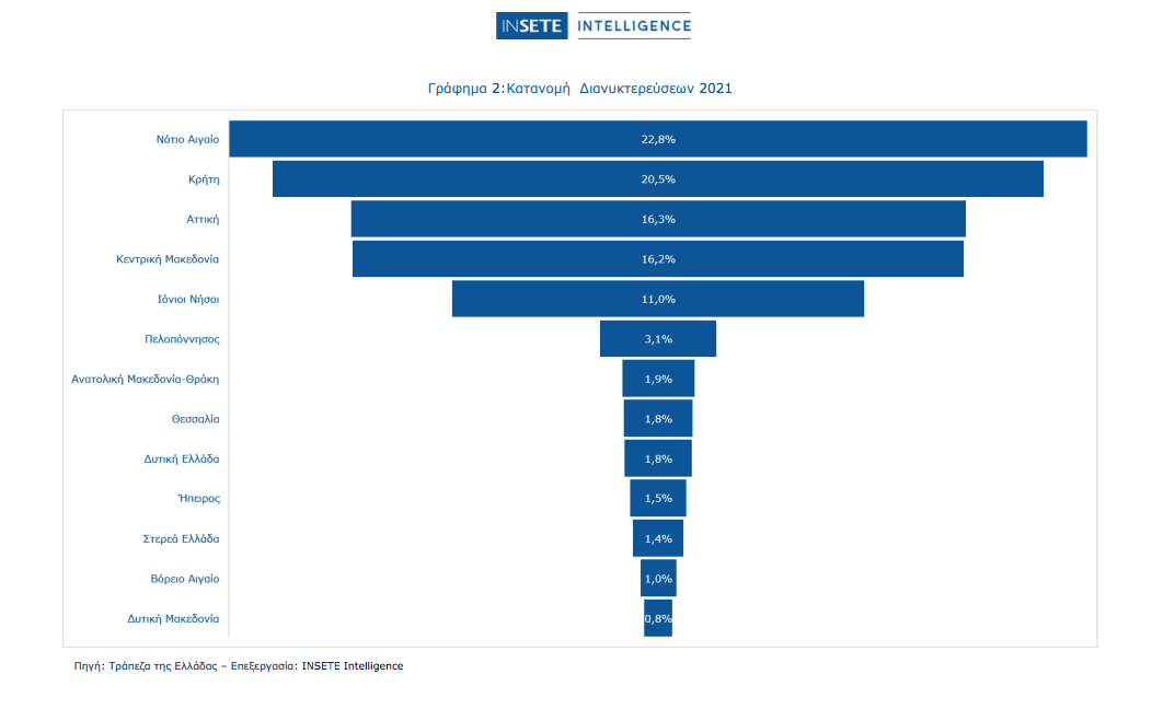 Το 86,7% των διανυκτερεύσεων πραγματοποιήθηκε στις εξής πέντε περιφέρειες: Νοτίου Αιγαίου (22,8%), Κρήτης (20,5%), Αττικής (16,3%), Κεντρικής Μακεδονίας (16,2%) και Ιονίων Νήσων (11,0%).