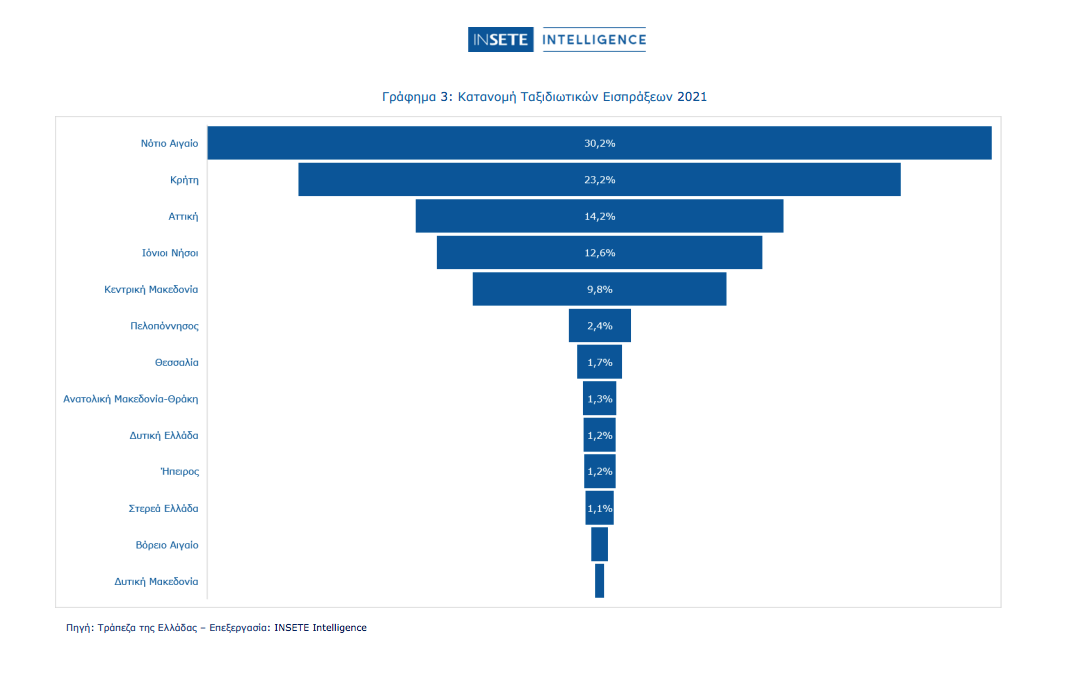 Tο 90,0% των εισπράξεων πραγματοποιήθηκε στις εξής πέντε περιφέρειες: Νοτίου Αιγαίου (30,2%), Κρήτης (23,2%), Αττικής (14,2%), Ιονίων Νήσων (12,6%), και Κεντρικής Μακεδονίας (9,8%).