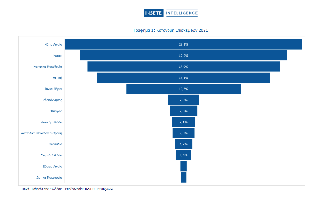 Το 86,0% των επισκέψεων πραγματοποιήθηκε στις εξής πέντε περιφέρειες: Νοτίου Αιγαίου (22,1%), Κρήτης (19,2%), Κεντρικής Μακεδονίας (17,9%), Αττικής (16,1%), και Ιονίων Νήσων (10,6%).