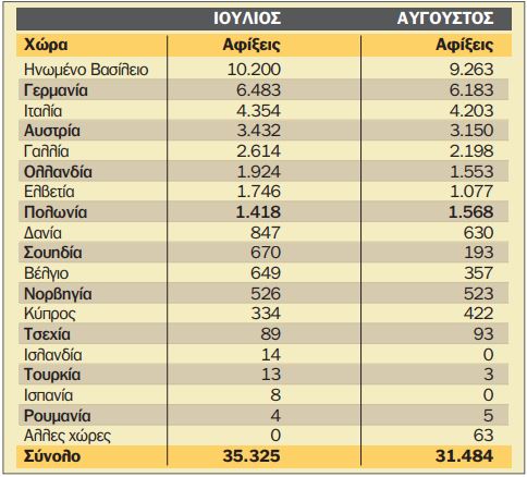 Από το Ηνωμένο Βασίλειο αφίχθησαν στην Καλαμάτα 9.263 επιβάτες (29,4% των συνολικών αφίξεων, από τη Γερμανία 6.183 (19,6%), την Ιταλία 4. 203 (13,3%) και την Αυστρία 3.150 (10,1%).