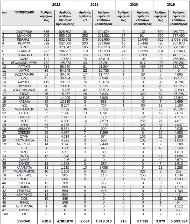 Αναλυτικά τα στοιχεία για το τουρισμό κρουαζιέρας παρουσιάζονται στον πίνακα: