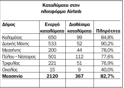 Σύμφωνα με αντίστοιχη έρευνα στην πλατφόρμα Airbnb η πληρότητα των καταλυμάτων βραχυχρόνιας μίσθωσης στο Δήμος Δυτικής Μάνης αγγίζει το 90,2% στο Δήμος Καλαμάτας το 84,8% και στο Δήμο Μεσσήνης το 78%.