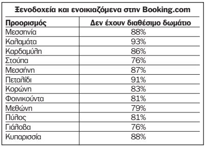To 88% των ξενοδοχείων και των ενοικιαζόμενων δωματίων στην Μεσσηνία δεν έχουν διαθέσιμο δωμάτιο μέσω διαδικτύου για το Πάσχα και ταυτόχρονα η πληρότητα στα καταλύματα βραχυχρόνιας μίσθωσης που διατίθενται μέσω της πλατφόρμας Airbnb αγγίζει το 82,7%.