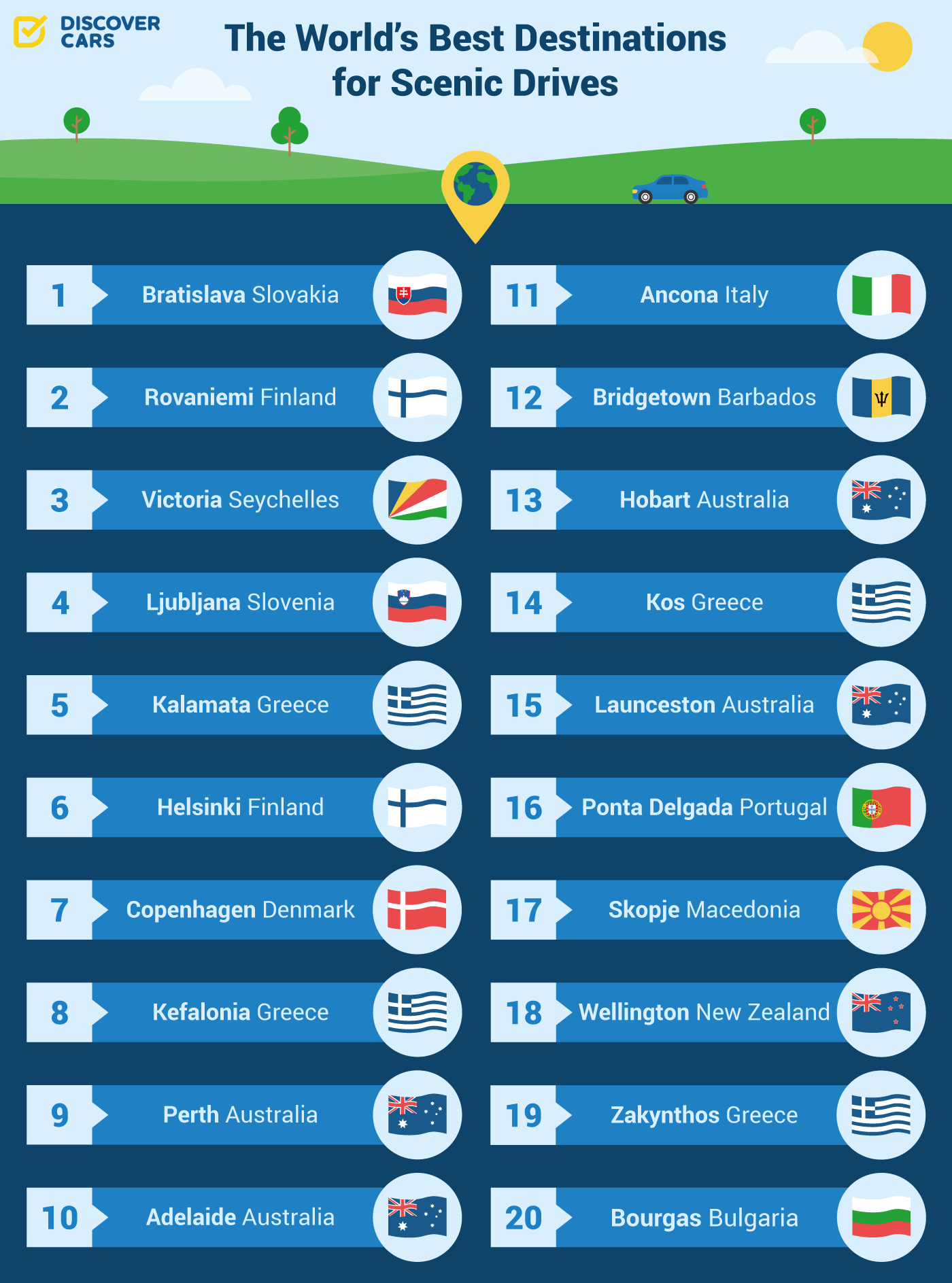 Η DiscoverCars.com αναφέρει για τη Καλαμάτα: «Στην πέμπτη θέση, με βαθμολογία 9,1/10, βρίσκεται η όμορφη μεσογειακή πόλη της Καλαμάτας – που βρίσκεται στη χερσόνησο της Πελοποννήσου. Η πόλη είναι η πρωτεύουσα Περιφέρειας Πελοποννήσου (σ.σ. πιθανά εννοεί μεγαλύτερη πόλη) , όπου βρίσκεται το κεντρικό λιμάνι της περιοχής. Η Καλαμάτα έχει πολλά να προσφέρει στους ταξιδιώτες που αναζητούν μια γραφική διαδρομή για να δει  εντυπωσιακά ορεινά τοπία, πολύβουα ψαροκάικα και γραφικά λιθόστρωτα δρομάκια.