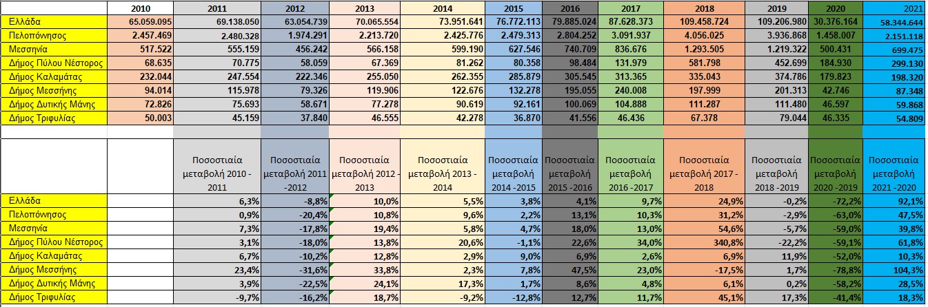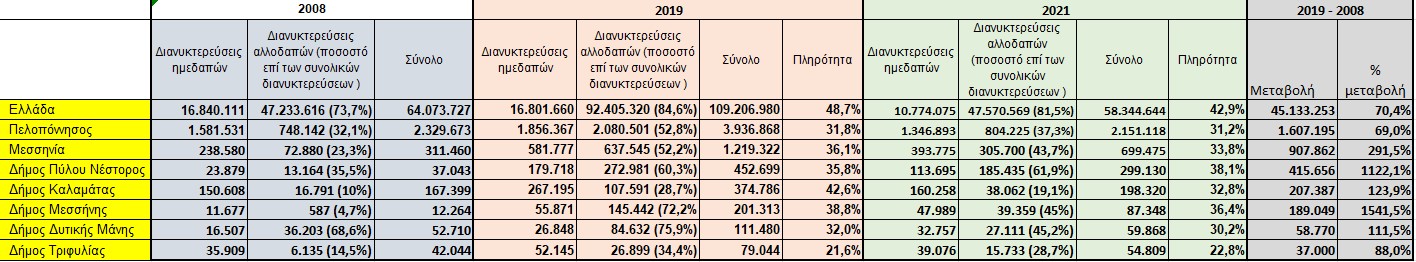 Την ίδια περίοδο, σε επίπεδο Μεσσηνίας οι συνολικές διανυκτερεύσεις αυξήθηκαν κατά 291,5%, στην Πελοπόννησο 69% και πανελληνίως 70,4%. Στο Δήμο Καλαμάτας η αντίστοιχη αύξηση ήταν 123,9% στο Δήμο Δυτικής Μάνης 111,5% και στο Δήμο Τριφυλίας 88%.