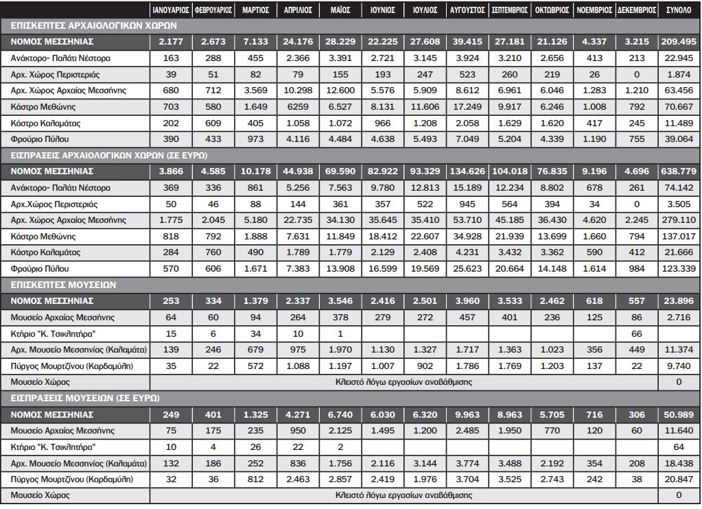 Αναλυτικά οι επισκέπτες και οι εισπράξεις των αρχαιολογικών χώρων και των μουσείων της Μεσσηνίας ανά μήνα του 2022 παρουσιάζονται στον πίνακα: