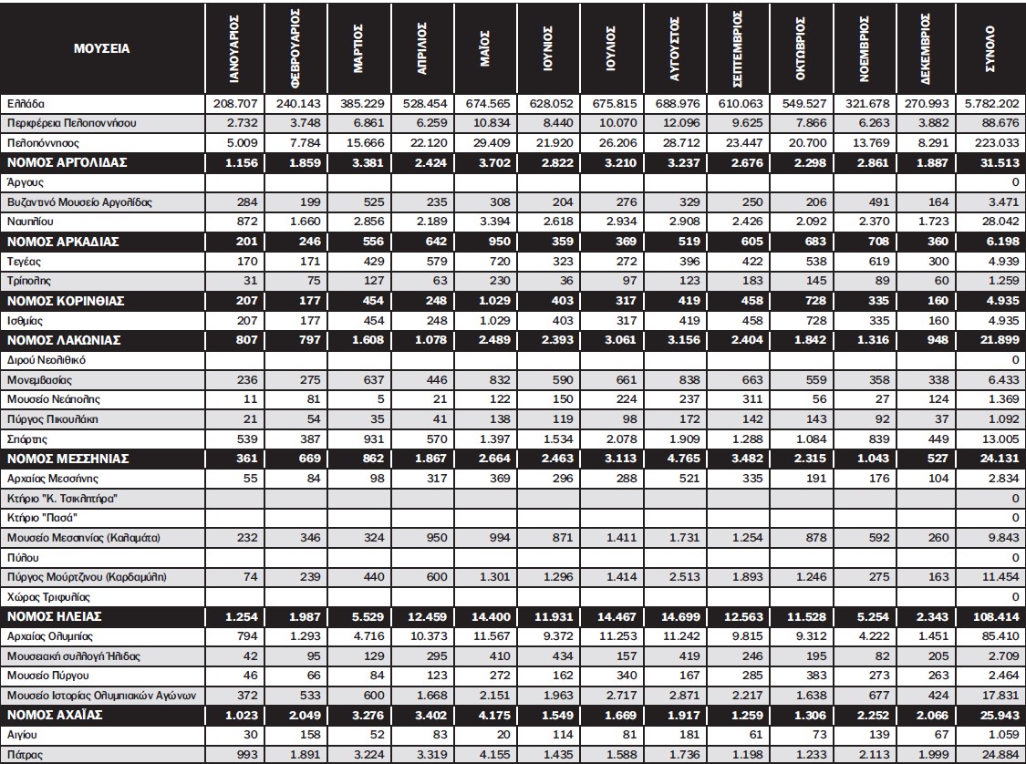 Αναλυτικά οι επισκέψεις στα μουσεία της Πελοποννήσου ανά μήνα παρουσιάζονται στον πίνακα: